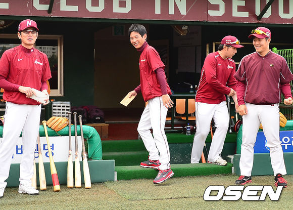 15일 오후 서울 목동구장에서 열린 2013 한국야쿠르트 세븐프로야구 넥센 히어로즈와 한화 이글스의 경기, 경기 전 염경엽 감독이 선수단에게 스승의 날 선물로 상품권을 건네받은 후 미소짓고 있다.