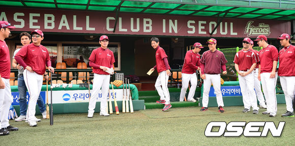 15일 오후 서울 목동구장에서 열린 2013 한국야쿠르트 세븐프로야구 넥센 히어로즈와 한화 이글스의 경기, 경기 전 염경엽 감독이 선수단으로부터 스승의 날 선물로 상품권을 건네받은 후 미소짓고 있다.