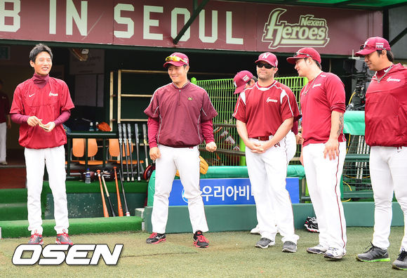 15일 오후 서울 목동구장에서 열린 2013 한국야쿠르트 세븐프로야구 넥센 히어로즈와 한화 이글스의 경기, 경기 전 염경엽 감독이 선수단에게 스승의 날 선물로 상품권을 건네받은 후 미소짓고 있다.