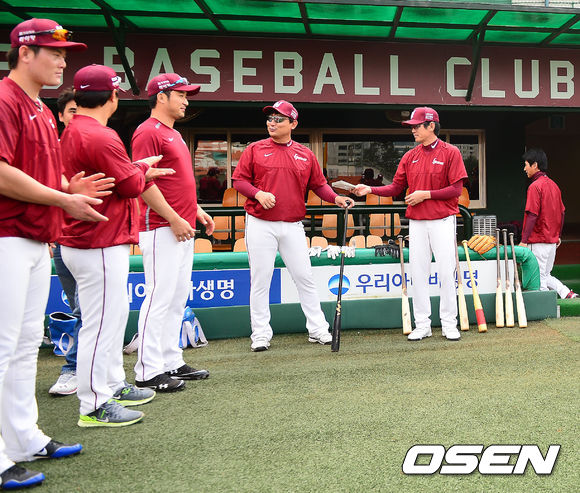 15일 오후 서울 목동구장에서 열린 2013 한국야쿠르트 세븐프로야구 넥센 히어로즈와 한화 이글스의 경기, 경기 전 염경엽 감독과 코치진들이 선수단에게 스승의 날 선물로 상품권을 건네받은 후 미소짓고 있다.