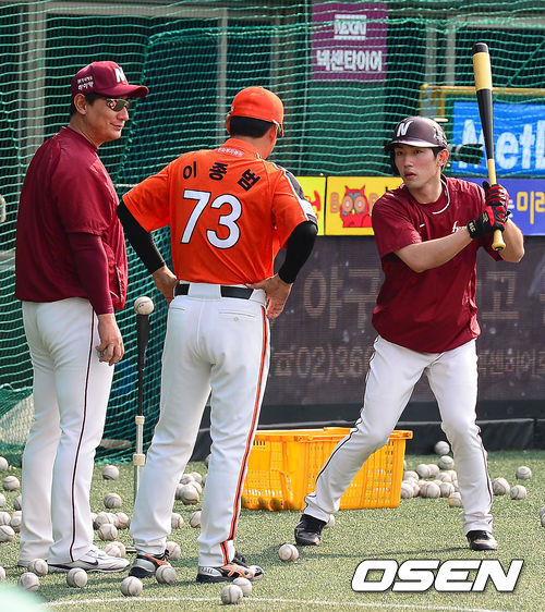 15일 오후 서울 목동구장에서 열린 2013 한국야쿠르트 세븐프로야구 넥센 히어로즈와 한화 이글스의 경기, 경기 전 한화 이종범 코치가 넥센 심재학 코치 앞에서 타격 연습을 하던 서건창에게 말을 걸고 있다.