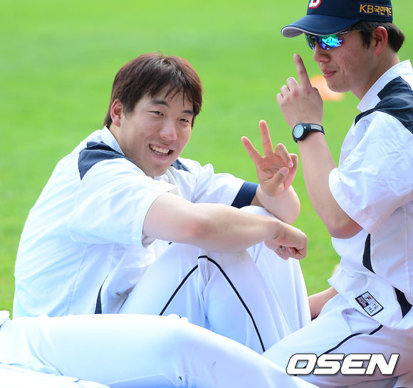 15일 오후 서울 잠실구장에서 열리는 '2013 한국야쿠르트 세븐 프로야구' 두산 베어스와 삼성 라이온즈의 경기 시작 전 김현수가 카메라를 향해 포즈를 취하고 있다.