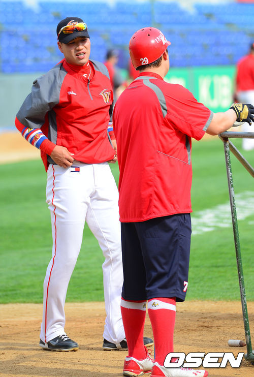 15일 오후 광주 무등구장에서 열린 '2013 한국야쿠르트 세븐 프로야구' KIA 타이거즈와 SK 와이번스의 경기전, KIA 나지완이 SK 김상현과 이야기를 나누고 있다.