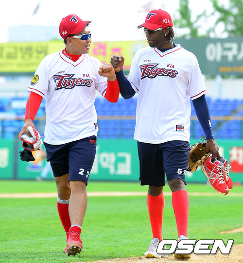 15일 오후 광주 무등구장에서 열린 '2013 한국야쿠르트 세븐 프로야구' KIA 타이거즈와 SK 와이번스의 경기전, KIA 소사와 김상훈이 훈련을 마친후 어깨동무를 하며 더그아웃으로 들어가고 있다