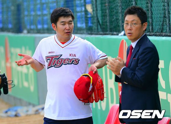 15일 오후 광주 무등구장에서 열린 '2013 한국야쿠르트 세븐 프로야구' KIA 타이거즈와 SK 와이번스의 경기전, KIA 송은범이 김정준 해설위원과 이야기를 나누고 있다. 두사람은 2년전 SK에서 선수와 코디네이션 코치로 한솥밥을 먹은 바 있다.