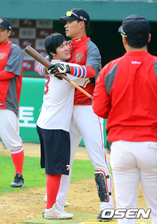 15일 오후 광주 무등구장에서 열린 '2013 한국야쿠르트 세븐 프로야구' KIA 타이거즈와 SK 와이번스의 경기전, KIA 김선빈과 SK 김상현이 인사를 하고 있다
