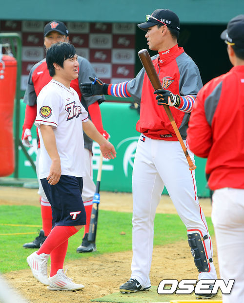 15일 오후 광주 무등구장에서 열린 '2013 한국야쿠르트 세븐 프로야구' KIA 타이거즈와 SK 와이번스의 경기전, KIA 김선빈과 SK 김상현이 인사를 하고 있다