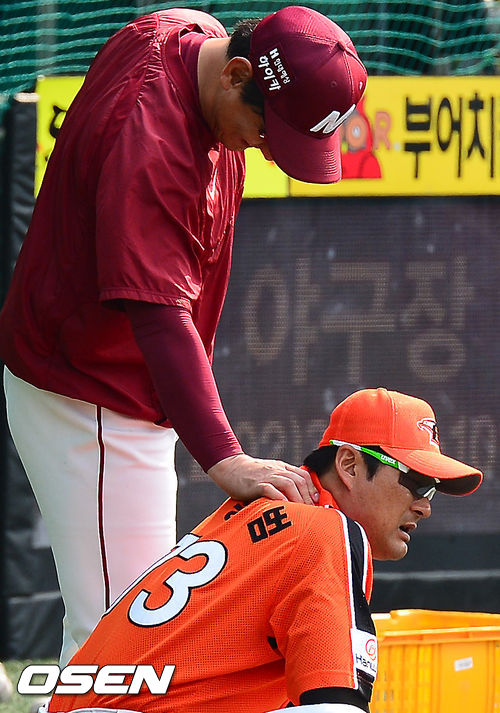 15일 오후 서울 목동구장에서 열린 2013 한국야쿠르트 세븐프로야구 넥센 히어로즈와 한화 이글스의 경기, 경기 전 넥센 심재학 코치가 한화 이종범 코치의 목을 주물러 주고 있다.