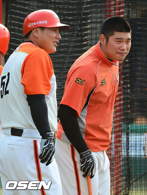 15일 오후 서울 목동구장에서 열린 2013 한국야쿠르트 세븐프로야구 넥센 히어로즈와 한화 이글스의 경기, 경기 전 한화 최진행과 김태균이 타격연습을 기다리며 미소짓고 있다.