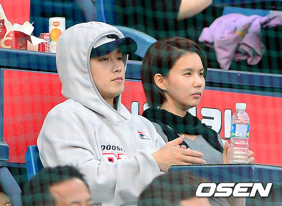 15일 오후 서울 잠실구장에서 열린 '2013 한국야쿠르트 세븐 프로야구' 두산 베어스와 삼성 라이온즈의 경기, 박시은-진태현이 경기를 관전하고 있다.