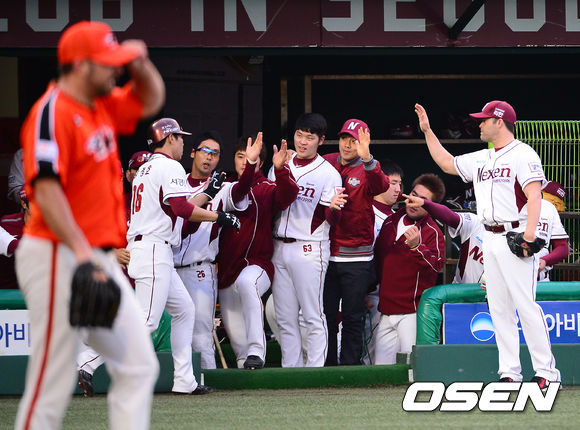 15일 오후 서울 목동구장에서 열린 2013 한국야쿠르트 세븐프로야구 넥센 히어로즈와 한화 이글스의 경기, 2회말 2사 주자 1,2루 넥센 김민성의 우중간 선취 1타점 적시타때 홈을 밟은 강정호가 덕아웃에서 동료들과 하이파이브를 하고 있다.