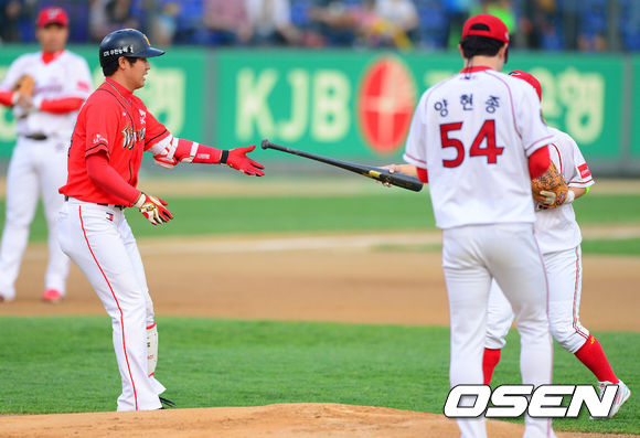 15일 오후 광주 무등구장에서 열린 '2013 한국야쿠르트 세븐 프로야구' KIA 타이거즈와 SK 와이번스의 경기, 1회초 1사 3루 SK 최정이 방망이를 놓친후 KIA김선빈에게 방망이를 건네받고 있다