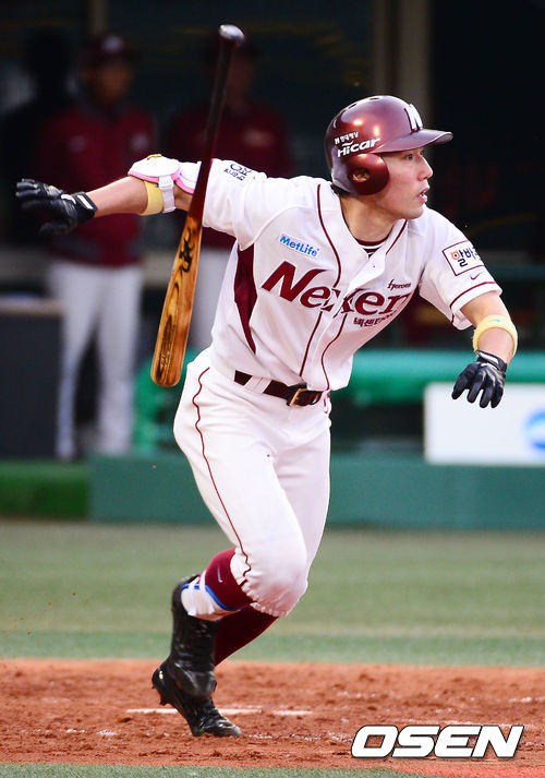 15일 오후 서울 목동구장에서 열린 2013 한국야쿠르트 세븐프로야구 넥센 히어로즈와 한화 이글스의 경기, 2회말 2사 주자 1,2루 넥센 서건창이 중견수 앞 1타점 적시타를 날리고 있다.