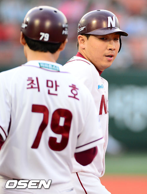 15일 오후 서울 목동구장에서 열린 2013 한국야쿠르트 세븐프로야구 넥센 히어로즈와 한화 이글스의 경기, 2회말 2사 주자 1,3루 넥센 허도환이 우익수 앞 1타점 적시타를 날린 후 1루에서 최만호 코치와 하이파이브를 하고 있다.