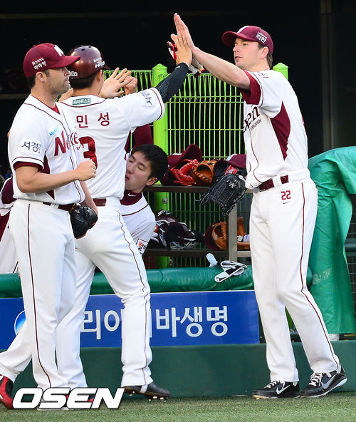 15일 오후 서울 목동구장에서 열린 2013 한국야쿠르트 세븐프로야구 넥센 히어로즈와 한화 이글스의 경기, 2회말 2사 주자 1,2루 넥센 서건창의 중견수 앞 1타점 적시타때 홈을 밟은 김민성이 덕아웃에서 선발 밴헤켄과 하이파이브를 하고 있다.