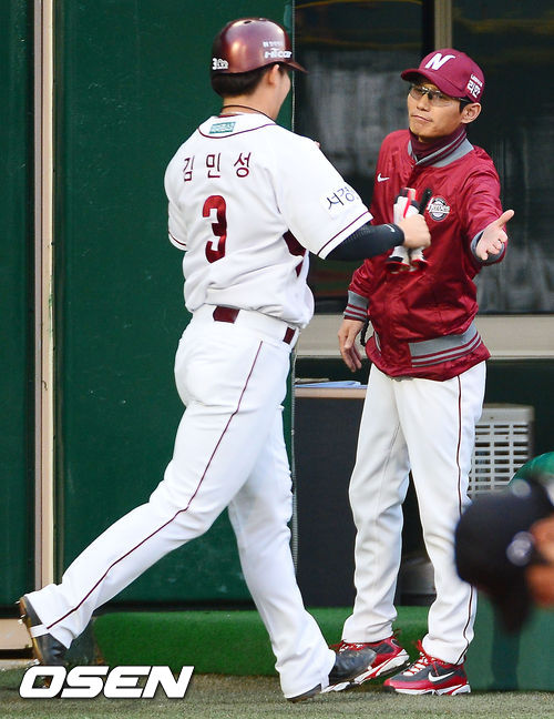 15일 오후 서울 목동구장에서 열린 2013 한국야쿠르트 세븐프로야구 넥센 히어로즈와 한화 이글스의 경기, 2회말 2사 주자 1,2루 넥센 서건창의 중견수 앞 1타점 적시타때 홈을 밟은 김민성이 덕아웃에서 넥센 염경엽 감독과 하이파이브를 하고 있다.