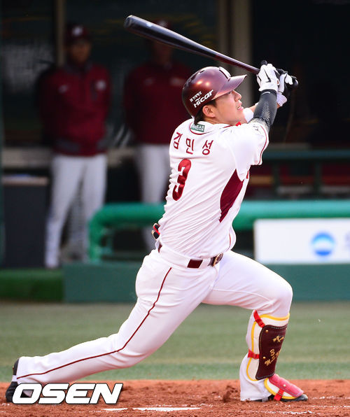 15일 오후 서울 목동구장에서 열린 2013 한국야쿠르트 세븐프로야구 넥센 히어로즈와 한화 이글스의 경기, 2회말 2사 주자 1,2루 넥센 김민성이 우중간 선취 1타점 적시타를 날리고 있다.