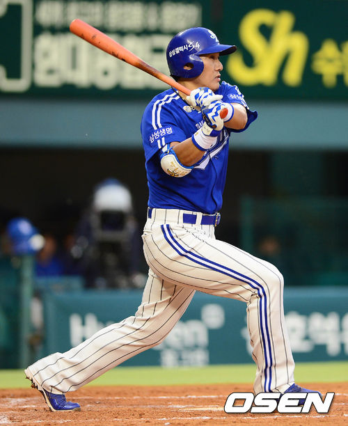 15일 오후 서울 잠실구장에서 열린 '2013 한국야쿠르트 세븐 프로야구' 두산 베어스와 삼성 라이온즈의 경기 3회초 1사 1루 이승엽이 1타점 2루타를 치고 있다.