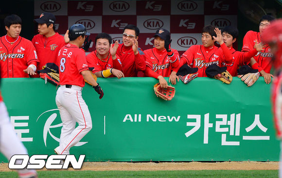 15일 오후 광주 무등구장에서 열린 '2013 한국야쿠르트 세븐 프로야구' KIA 타이거즈와 SK 와이번스의 경기, 1회초 2사 3루 SK 최정의 선취 1타점 적시타때 3루 주자 정근우가 홈을 밟은 뒤 동료들의 축하를 받고 있다