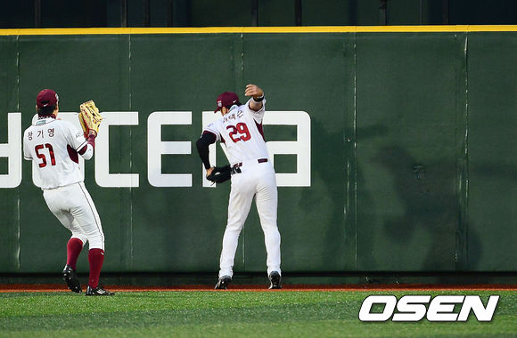 15일 오후 서울 목동구장에서 열린 2013 한국야쿠르트 세븐프로야구 넥센 히어로즈와 한화 이글스의 경기, 4회초 2사 주자 2루 한화 정현석의 타구를 넥센 중견수 이택근이 달려가며 잡아내고 있다.