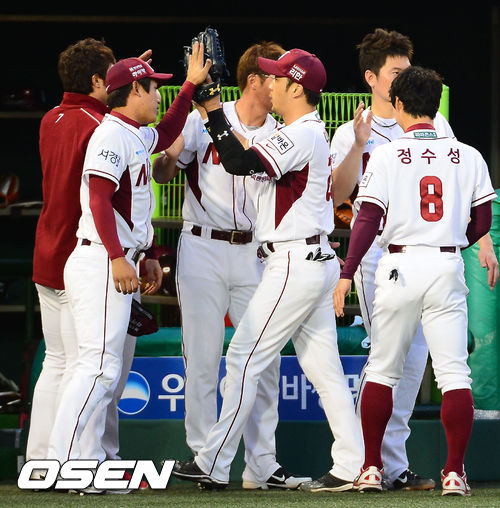 15일 오후 서울 목동구장에서 열린 2013 한국야쿠르트 세븐프로야구 넥센 히어로즈와 한화 이글스의 경기, 4회초 2사 주자 2루 한화 정현석의 타구를 넥센 중견수 이택근이 달려가며 잡아낸 후 덕아웃에서 동료들과 하이파이브를 하고 있다.