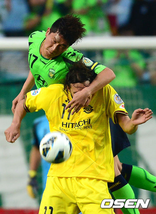 15일 오후 전북 전주시 전주월드컵경기장에서 열린 2013 아시아축구연맹(AFC) 챔피언스리그 16강 전북 현대와 가시와 레이솔의 경기 전반 전북 임유환이 공중볼 다툼을 벌이고 있다.