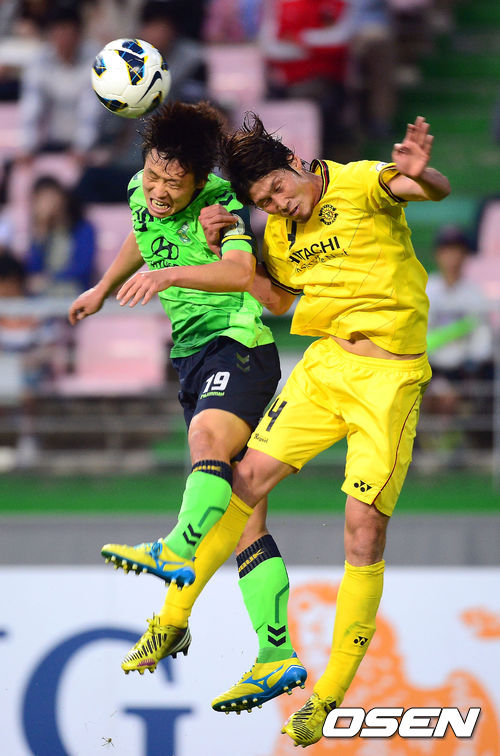 15일 오후 전북 전주시 전주월드컵경기장에서 열린 2013 아시아축구연맹(AFC) 챔피언스리그 16강 전북 현대와 가시와 레이솔의 경기 전반 전북 박원재가 공중볼 다툼을 벌이고 있다.