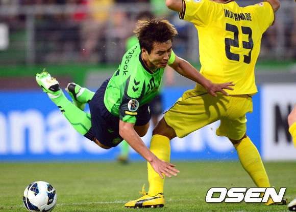 15일 오후 전북 전주시 전주월드컵경기장에서 열린 2013 아시아축구연맹(AFC) 챔피언스리그 16강 전북 현대와 가시와 레이솔의 경기 전반 전북 이동국이 반칙에 걸려 넘어지고 있다.