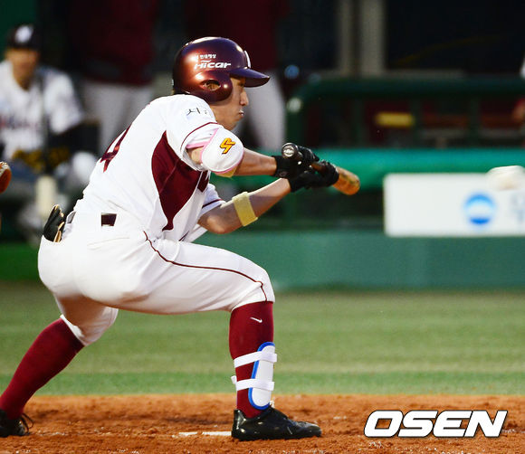 15일 오후 서울 목동구장에서 열린 2013 한국야쿠르트 세븐프로야구 넥센 히어로즈와 한화 이글스의 경기, 4회말 무사 주자 1,2루 넥센 서건창이 희생번트에 성공하고 있다.