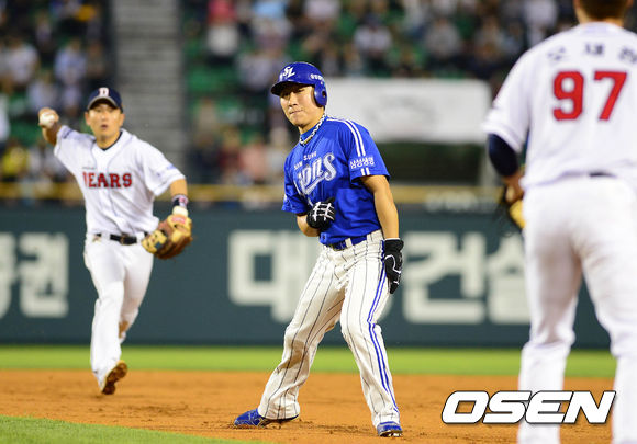 15일 오후 서울 잠실구장에서 열린 '2013 한국야쿠르트 세븐 프로야구' 두산 베어스와 삼성 라이온즈의 경기 4회초 1사 1,3루 정형식의 타석, 1루주자 배영섭이 김창훈의 견제구에 걸려 아웃당하고 있다.