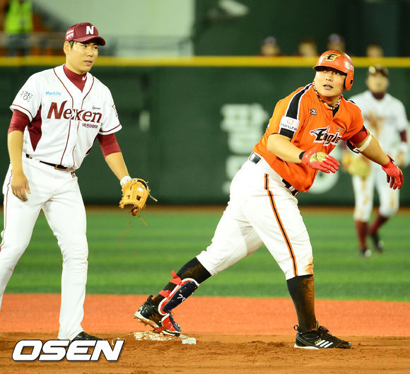 15일 오후 서울 목동구장에서 열린 2013 한국야쿠르트 세븐프로야구 넥센 히어로즈와 한화 이글스의 경기, 7회초 한화 선두타자 김태균이 우중간 1루타를 날린 후 그대로 2루까지 달려 넥센 유격수 강정호에게 태그아웃을 당했다. 김태균이 아쉬움에 그대로 멈춰있다.