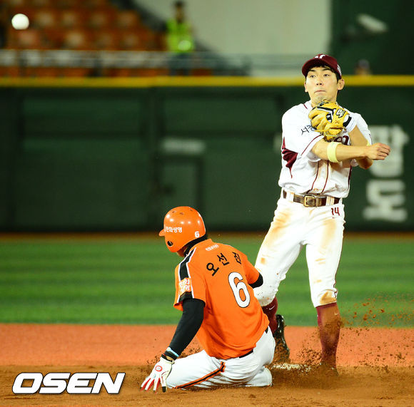 15일 오후 서울 목동구장에서 열린 2013 한국야쿠르트 세븐프로야구 넥센 히어로즈와 한화 이글스의 경기, 7회초 1사 주자 1루 한화 정형석의 3루수 병살타때 넥센 2루수 서건창이 2루에서 오선진을 포스아웃 시킨 후 1루로 송구하고 있다.