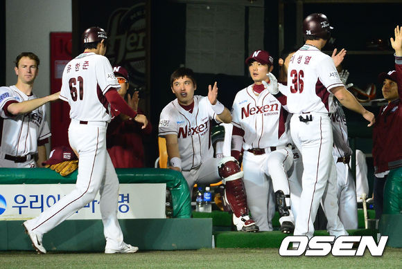 15일 오후 서울 목동구장에서 열린 2013 한국야쿠르트 세븐프로야구 넥센 히어로즈와 한화 이글스의 경기, 7회말 무사 주자 1,2루 넥센 김민성의 좌중간 2타점 적시타때 홈을 밟은 유한준과 이성열이 덕아웃에서 하이파이브를 하고 있다.