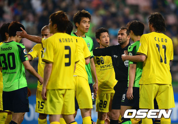 15일 오후 전북 전주시 전주월드컵경기장에서 열린 2013 아시아축구연맹(AFC) 챔피언스리그 16강 전북 현대와 가시와 레이솔의 경기 후반 전북 선수들과 가시와 선수들이 신경전을 벌이고 있다.
