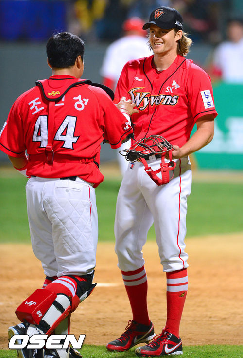15일 오후 광주 무등구장에서 열린 '2013 한국야쿠르트 세븐 프로야구' KIA 타이거즈와 SK 와이번스의 경기,5회말 무사 2,3루 KIA 신종길의 파울타구를 잡은 SK 조인성 포수가 세든 선발투수와 미소 지으며 이야기 나누고 있다