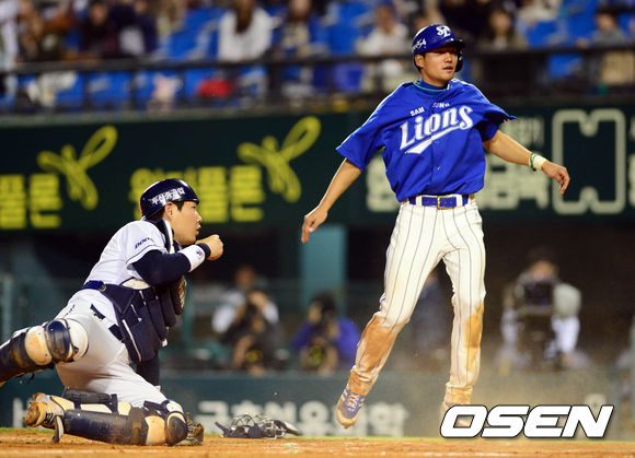 15일 오후 서울 잠실구장에서 열린 '2013 한국야쿠르트 세븐 프로야구' 두산 베어스와 삼성 라이온즈의 경기 8회초 1사 3루 배영섭의 희생플라이에 김상수가 홈에서 세이프되고 있다.