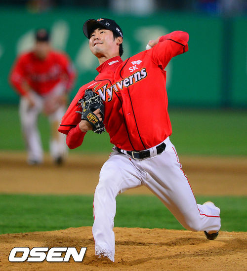 15일 오후 광주 무등구장에서 열린 '2013 한국야쿠르트 세븐 프로야구' KIA 타이거즈와 SK 와이번스의 경기,7회말 SK 진해수 투수가 역투하고 있다