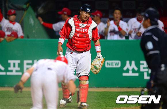 15일 오후 광주 무등구장에서 열린 '2013 한국야쿠르트 세븐 프로야구' KIA 타이거즈와 SK 와이번스의 경기,7회말 무사 2,3루 KIA나지완의 타석, SK 전유수 투수의 폭투때 실점을 허용한 조인성 포수가 아쉬워하고 있다