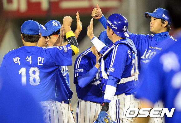 15일 오후 서울 잠실구장에서 열린 '2013 한국야쿠르트 세븐 프로야구' 두산 베어스와 삼성 라이온즈의 경기 종료 후 삼성 선수들이 하이파이브를 하고 있다.