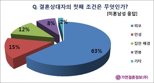 결혼정보회사 가연과 가연결혼정보가 운영하는 프리미엄 매칭 사이트 안티싱글에서 미혼남성 320명을 대상으로 ‘결혼상대자의 첫째 조건은 무엇인가?’라는 설문 진행 결과, 63%의 남성이 ‘외모’라고 답해 가장 많은 응답률을 보인 것으로 나타났다. 2위는 ‘인성’(15%), 3위는 ‘집안 배경’(12%), 4위는 ‘연봉’(8%), 기타(2%) 순으로 집계됐다.