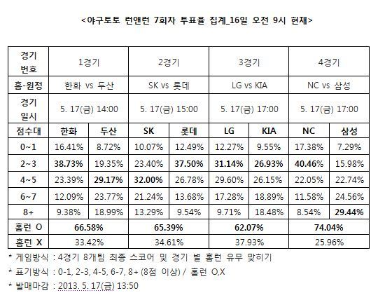 한화-두산, SK-롯데, LG-KIA, NC-삼성전을 대상으로 진행되는 야구토토 런앤런 7회차 게임은 경기시작 10분 전인 17일 오후 1시 50분에 발매가 마감된다.