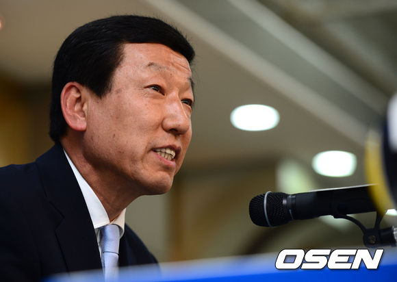 최강희 감독이 질문에 답을 하며 미소짓고 있다.