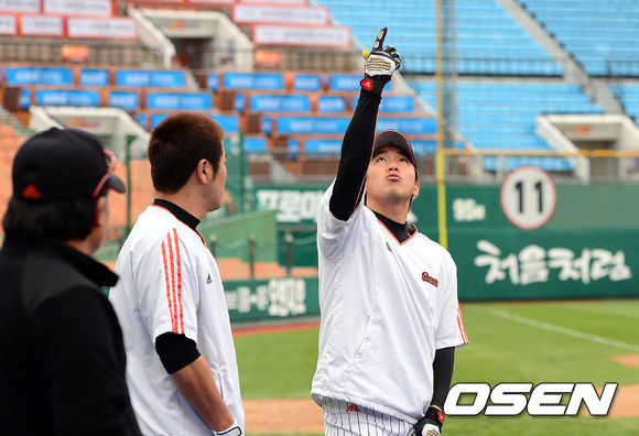16일 오후 부산 사직구장에서 열리는 '2013 한국야쿠르트 세븐 프로야구' 롯데 자이언츠와 NC 다이노스의 경기에 앞서 롯데 전준우가 강민호, 박흥식 코치와 이야기를 나누고 있다.