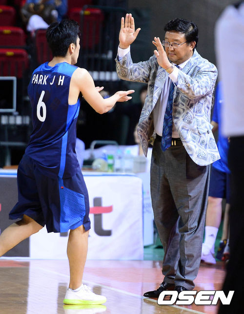16일 오후 인천 삼산월드체육관에서 열린 '제3회 동아시아 남자농구선수권대회' 한국과 일본의 경기 2쿼터 작전타임, 최부영 감독이 박재현과 하이파이브를 하고 있다.