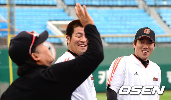 16일 오후 부산 사직구장에서 열리는 '2013 한국야쿠르트 세븐 프로야구' 롯데 자이언츠와 NC 다이노스의 경기에 앞서 롯데 박흥식 코치가 전준우 타구에 대해 이야기를 하고 있다