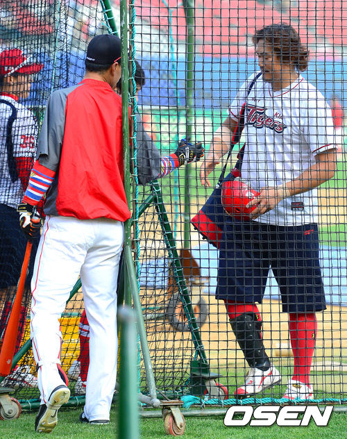 16일 오후 광주 무등구장에서 열린 '2013 한국야쿠르트 세븐 프로야구' KIA 타이거즈와 SK 와이번스의 경기전, KIA 최희섭과 SK 김상현이 악수를 나누고 있다
