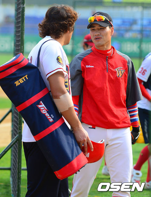 16일 오후 광주 무등구장에서 열린 '2013 한국야쿠르트 세븐 프로야구' KIA 타이거즈와 SK 와이번스의 경기전, KIA 최희섭과 SK 김상현이 이야기를 나누고 있다