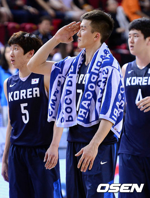 16일 오후 인천 삼산월드체육관에서 열린 '제3회 동아시아 남자농구선수권대회' 한국과 일본의 경기 종료 후 박찬희가 관중석을 향해 경례를 하고 있다.