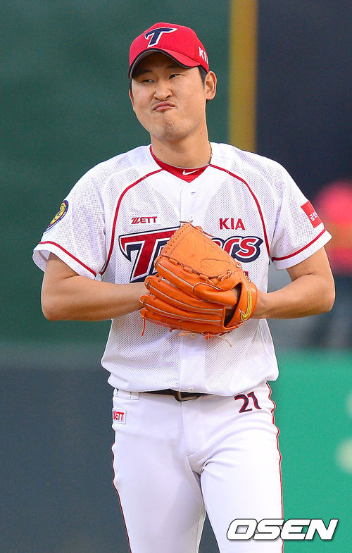 16일 오후 광주 무등구장에서 열린 '2013 한국야쿠르트 세븐 프로야구' KIA 타이거즈와 SK 와이번스의 경기 1회초 KIA 선발투수 윤석민이 익살스러운 표정을 짓고 있다