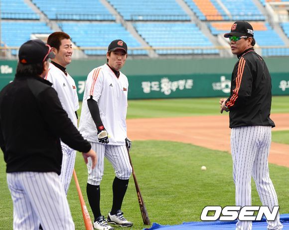 16일 오후 부산 사직구장에서 열리는 '2013 한국야쿠르트 세븐 프로야구' 롯데 자이언츠와 NC 다이노스의 경기에 앞서 롯데 전준우가 15일 경기서 플라이볼 타구에 나온 홈런 세리모니에 대해 김시진 감독 강민호, 박흥식 코치와 이야기를 나누고 있다.